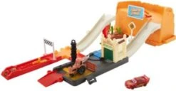 Coole und lustige Action bietet dieses Rennspielset von Mattel. Kleine Fans des beliebten Pixar Animationsfilms „Cars“ tauch hier ein in die Welt des Rennfahrens. Die Bahn lässt sich in unterschiedlichen Ausführungen zusammenbauen und verfügt über eine einzigartige Sprungschanze für waghalsige Manöver. Mit Hilfe des Starters schafft Lightning McQueen die Höhe mit links und kann danach ganz entspannt nach unten rollen. Da bleibt ein heftiger Adrenalinschub nicht aus. Die Gestaltung nimmt sich den Film zum Vorbild und verfügt sowohl über Luigis Reifenservice als auch über Hooks Abschleppservice. Die perfekte Ausstattung also, wenn doch mal etwa schief geht.