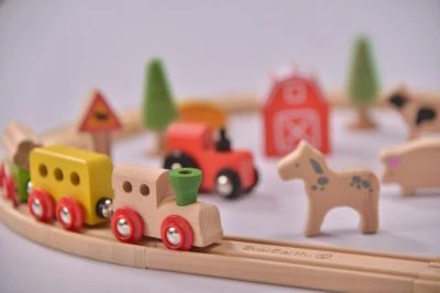 – zusammensteckbare Eisenbahnschienen, eine bunte Eisenbahn mit magnetischen Anhängern, unterschiedliche Tierarten und eine Scheune