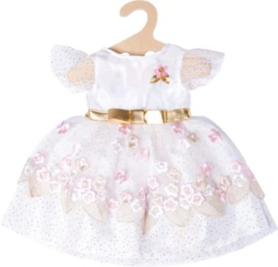 Großer Auftritt für kleine Majestätinnen. Mit dem hübschen Prinzessinnenkleid „Kirschblüte“ von Heless wird die Puppenstube zum Traumpalast. Über dem märchenhaften, mit goldenen Pünktchen gesprenkelten Tüllrock liegt sanft eine weitere feine Tüllschicht, die mit zarten Kirschblüten und Blättern wunderschön verziert ist. Das Oberteil schmückt eine Blütenapplikation mit goldenen Blättern. Das edle goldene Taillenband passt perfekt zur goldenen Krone, die mit ihrem elastischen Band auf jedes Puppenköpfchen passt. Das Kleid passt den meisten marktgängigen Puppen der Größe 35-45 cm.