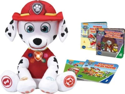 Zusammen mit Marshall spannende Geschichten lesen! Der plüschige Marshall liest vier PAW Patrol Abenteuergeschichten vor und ermutigt das Kind zum eigenständigen Lesen.